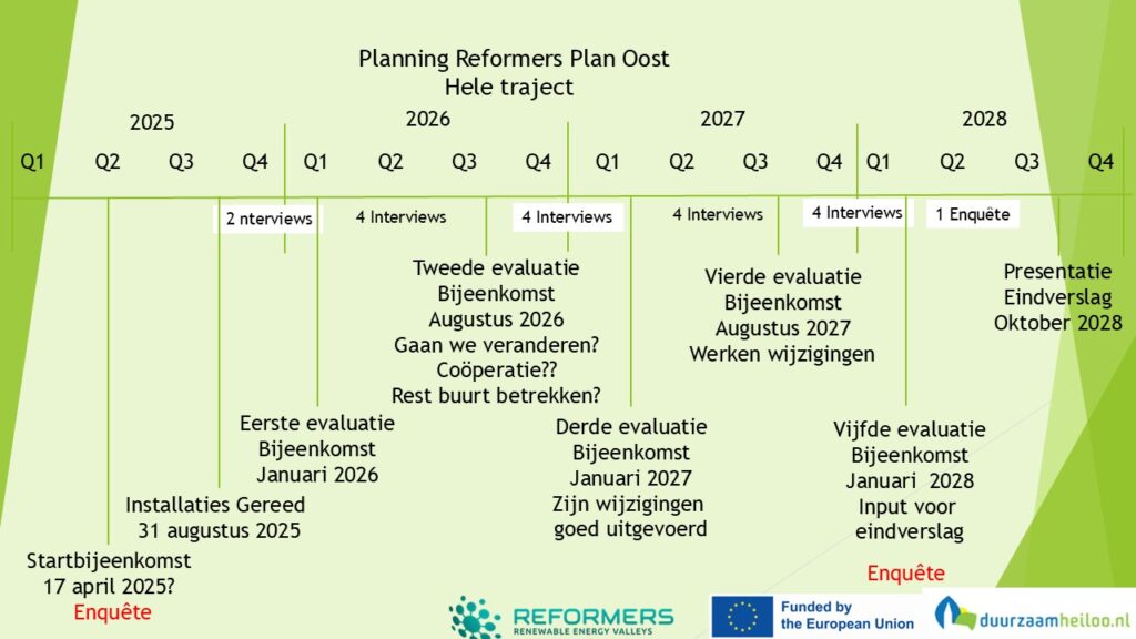 Op de onderstaande sheets van 17 april is het globale tijdspad weergegeven van het Reformers-project Heiloo Plan Oost. Dit project is in november 2023 van start gegaan en heeft een looptijd van vijf jaar. Dat betekent dat inmiddels ruim een jaar verstreken is. De gepresenteerde planning start vanaf april 2025 (waarbij ‘Q’ staat voor kwartaal).