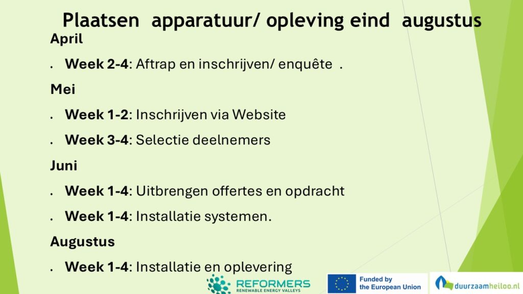 In april vindt de aftrap van de volgen deze projectfase plaats. Tijdens de tweede tot vierde week worden deelnemers uitgenodigd om zich in te schrijven en een enquête in te vullen. In mei verloopt de aanmelding via de website (week 1 en 2), gevolgd door de selectie van deelnemers in de tweede helft van de maand. Gedurende juni worden offertes uitgebracht en opdrachten verstrekt, en starten de installaties van de systemen. Deze installaties lopen door in juli en augustus, met als doel alles rond eind augustus op te leveren.