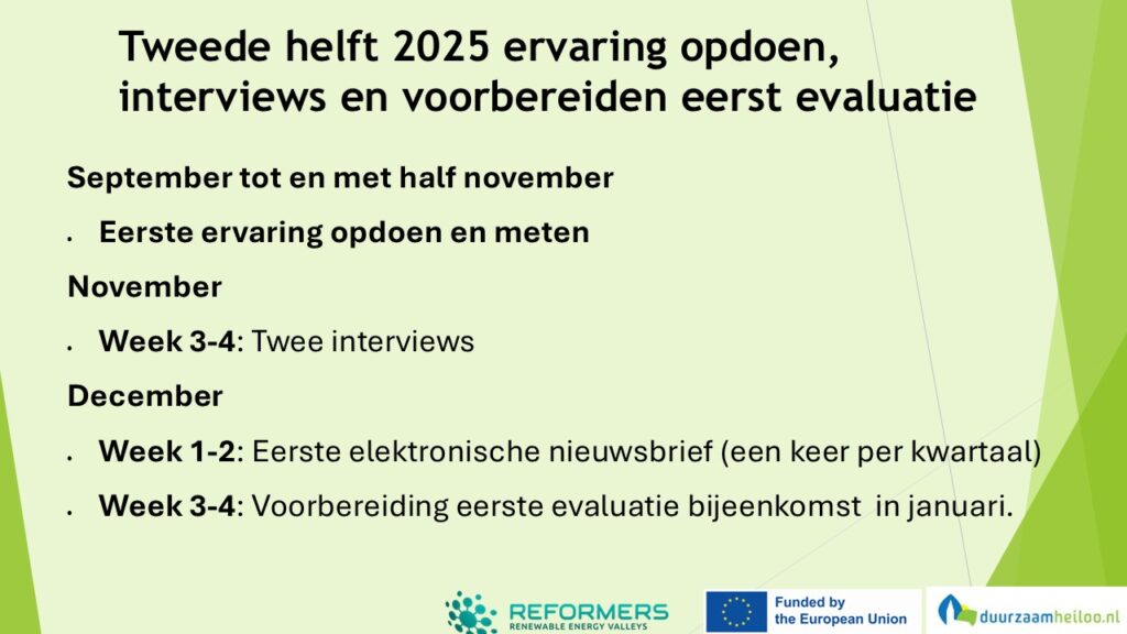 In januari 2026 vindt de eerste officiële evaluatie plaats. Deze datum valt samen met de inwerkingtreding van de nieuwe energiewet, die onder andere beter peer-to-peer uitwisseling van energie mogelijk maakt. Tijdens deze bijeenkomst zal besproken worden wat deze wetswijziging betekent voor het project en welke aanvullende acties eventueel nodig zijn. Hierbij wordt ook gekeken naar mogelijke samenwerking met andere verduurzamingsinitiatieven in Heiloo.